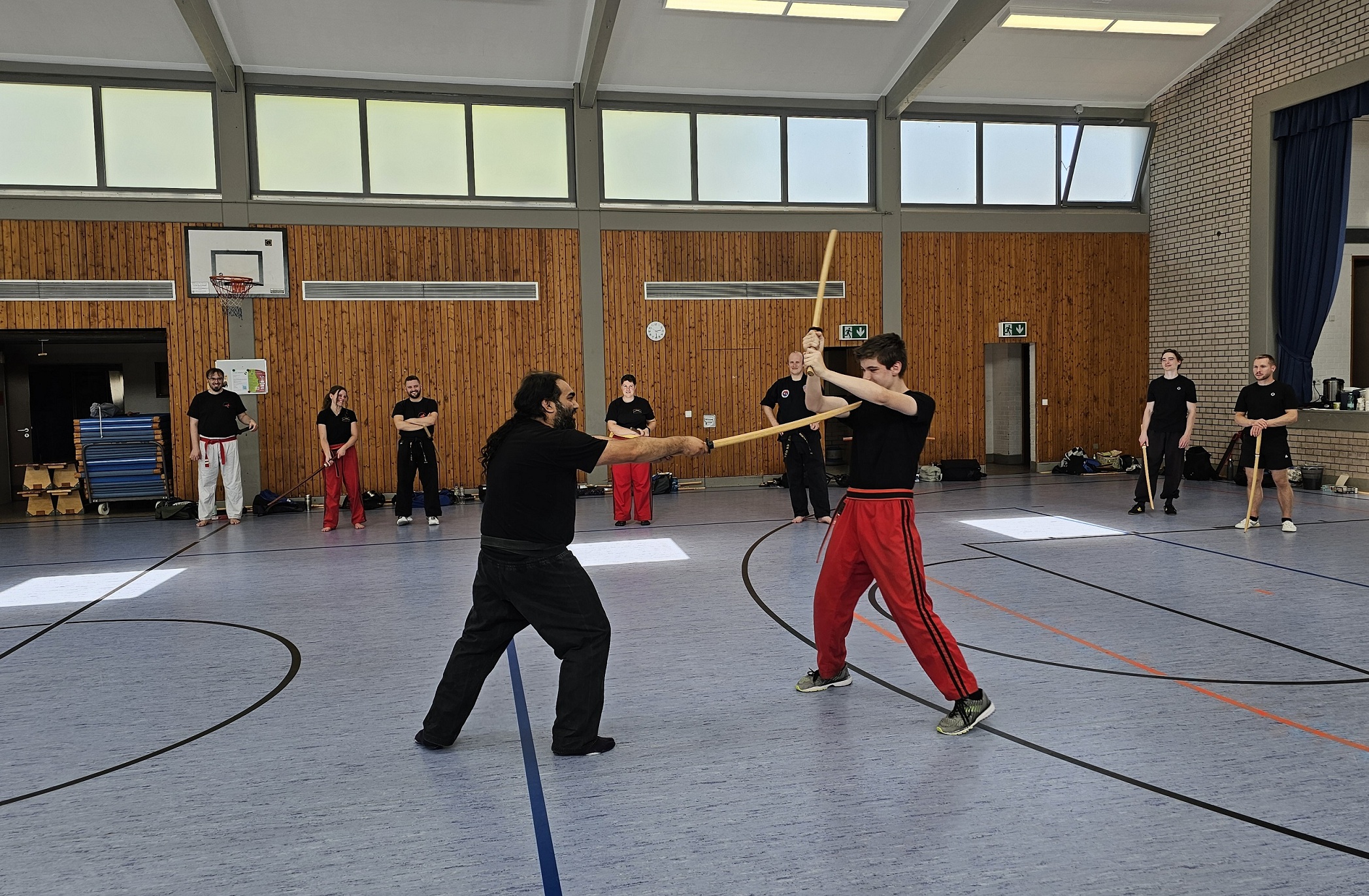 Thema des Seminars war der Kurzstock, ein etwa 1 bis 1,2m langer Stab. Mit diesem wurden Grundtechniken und Partnerübungen sowie eine Kata („Form“, eine choreographierte Abfolge verschiedener Techniken) geübt. Abgerundet wurde das Programm durch Qui Gong, Fitness-Übungen und intensives Dehnen. Nach dem ersten Trainingstag klang der Samstag bei einem gemeinsamen Essen und gemütlichem Beisammensein aus. Übernachtungsmöglichkeiten standen für alle Teilnehmer im Vereinsheim zur Verfügung.